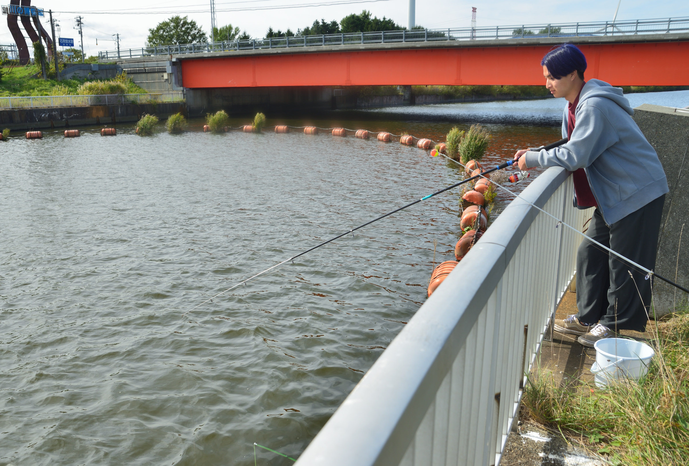 まずは川の博物館の対面で30分程チャレンジしましたが、風が南風で放水路奥に流されているようで、表層のウグイが30分で10匹程度釣れる程度でした。。。